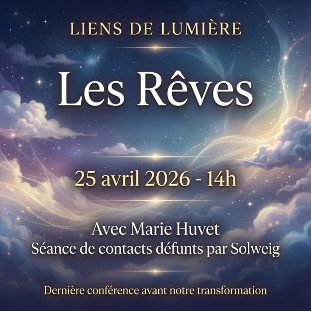 Réservez votre place Réservez votre place Samedi 25 Avril 2026 14h00 – 18h30 Les rêves : messages, mystères et révélations Depuis toujours, les rêves fascinent, interrogent et troublent. Pourquoi certains rêves semblent-ils si réels ?Pourquoi avons-nous parfois l’impression d’avoir “vu juste” avant même que les événements ne se produisent ? Lors de cette conférence, Marie…